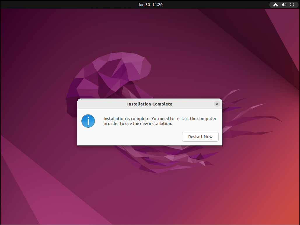 Depending upon the speed of the Internet connection, installation will typically take around fifteen minutes. When installation is complete, reboot the system with the command: