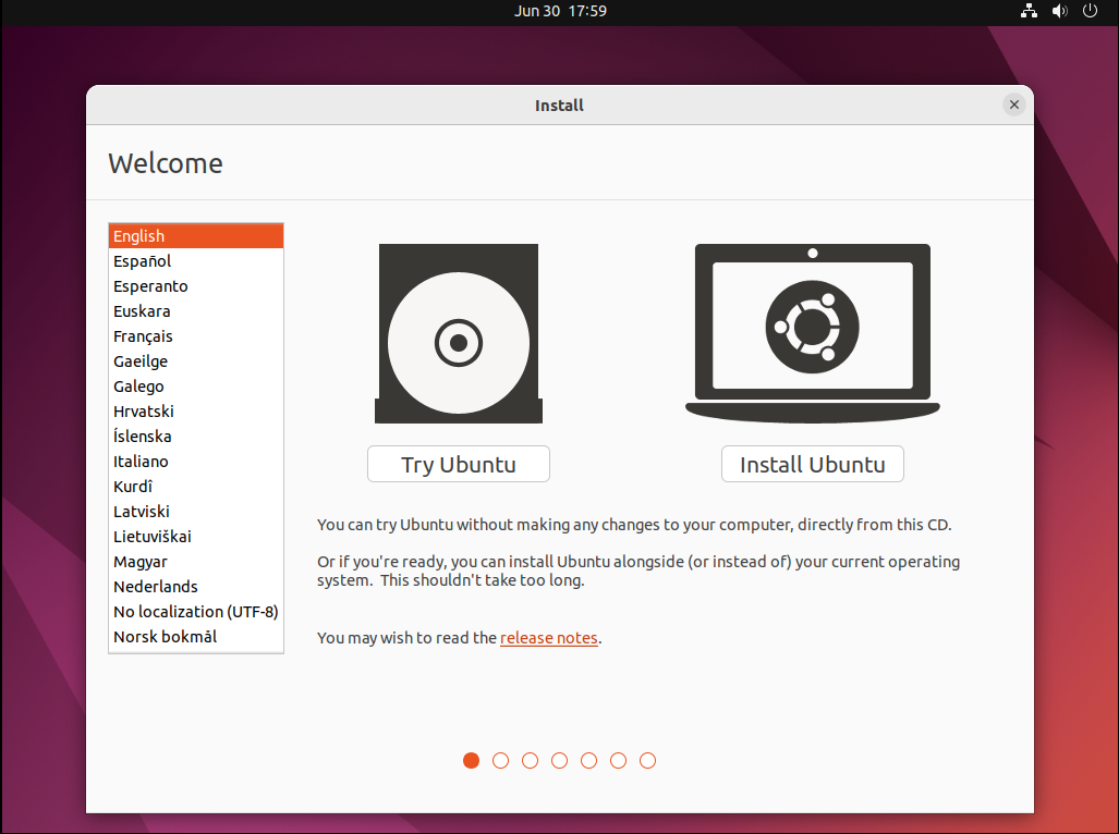 Boot the Ubuntu Desktop 22.04 LTS Jammy Jellyfish installation media (DVD or USB key). You should wind up at the initial boot screen.