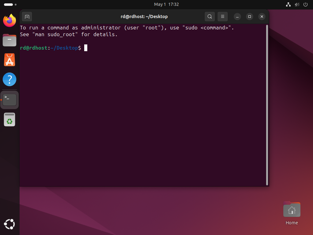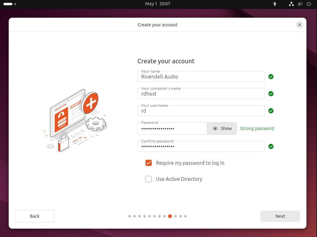 The system will reboot and come up to the login screen. Login in as user "rd", using the password that you set earlier.